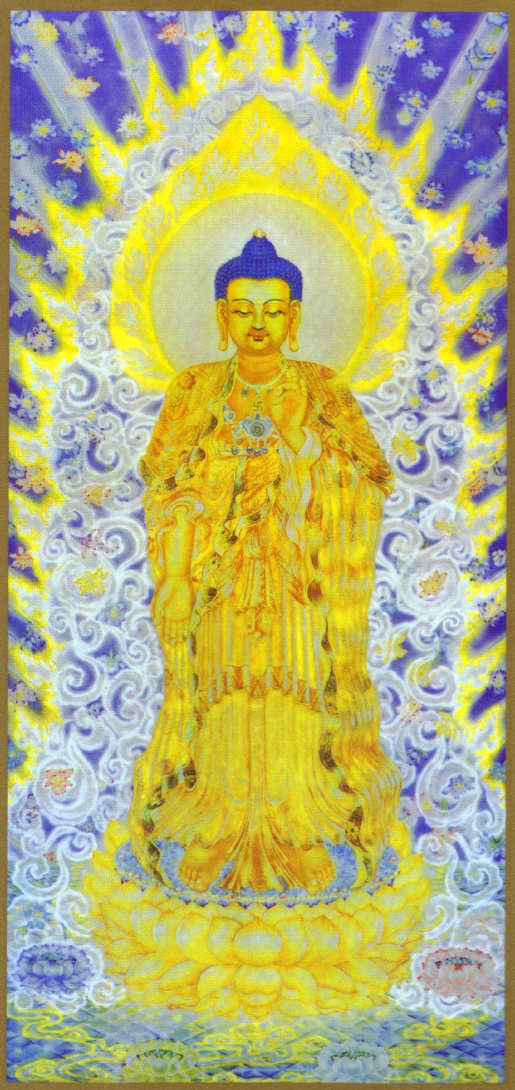 This painting is the masterpiece by Dharma Master Dao Zheng from Taiwan. Master Dao Zheng took meticulous effort to paint this detailed portrait of the Amitabha, by following descriptions she found in various Buddhist Sutras. If observed closely, one can see that even the marks on this Buddha's palms are presented with reverence and care.