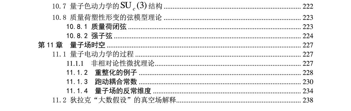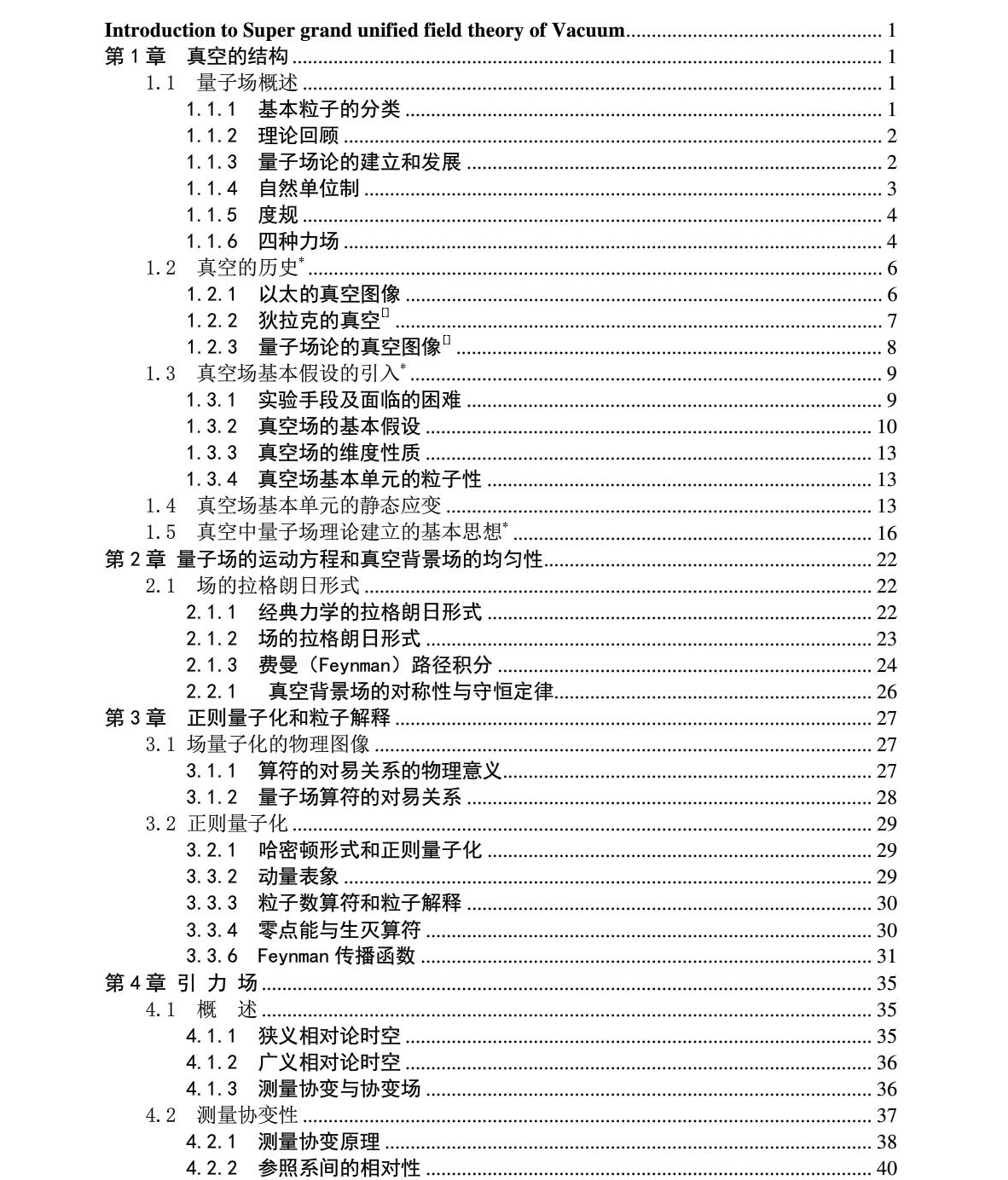 第一章 真空的结构...................................................................................... 1 1.1 量子场概述........................................................................................ 1 1.1.1 基本粒子的分类.................................................................................. 1 1.1.2 理论 ............................................................................................... 2 1.1.3 量子场论的建立和发展................................................................................. 3 1.1.4 自然单位制.................................................................................. 3 1.1.5 闵氏空间和洛仑兹群................................................................................ 4 1.2 真空物理图像的历史........................................................................................ 5 1.2.1 以太的真空图像........................................................................................ 5 1.2.2 狄拉克的真空[] .................................................................................... 6 1.2.3 量子场论的真空图像[] ................................................................................ 6 1.3 真空场的引入.............................................................................................. 7 1.3.1 实验手段及面临的困难............................................................................... 7 1.3.2 真空中量子场理论建立的基本思想.............................................................. 8 1.3.3 真空场图像的基本假设............................................................................... 16 1.3.4 真空场的维度性质....................................................................................... 18 1.3.5 真空场基本单元的粒子性........................................................................... 20 1.4 真空场基本单元的静态应变分析........................................................................... 20 1.4.1 位移和应变............................................................................................ 20