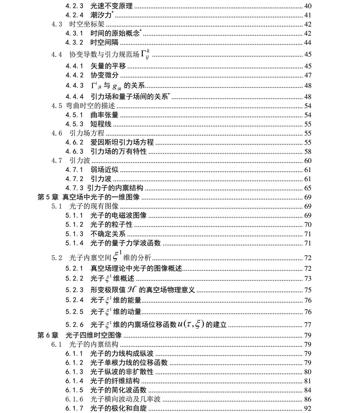 第六章 光子四维时空图像................................................. 127 6.1 光子的内禀结构.................................................. 127 6.1.1 光子的力线构成纵波........................................ 127 6.1.2 光子单根力线的位移函数.................................... 127 6.1.3 光子纵波的非扩散性........................................ 128 6.1.4 光子的纤维结构............................................ 129 6.1.5 光子的简化波函数.......................................... 133 6.1.6 光子横向波动及几率波...................................... 135 6.1.7 光子的极化和自旋.......................................... 141 6.1.8 光子波粒二象性的物理图像.................................. 146 6.2 电磁场理论...................................................... 147 6.2.1 电磁场的协变形式和Lorentz 条件............................ 148 6.2.2 Coulomb 规范量子化电磁场[] ................................. 149 6.2.3 Lorentz 规范量子化........................................ 159 6.2.4 动量表象和粒子解释........................................ 161