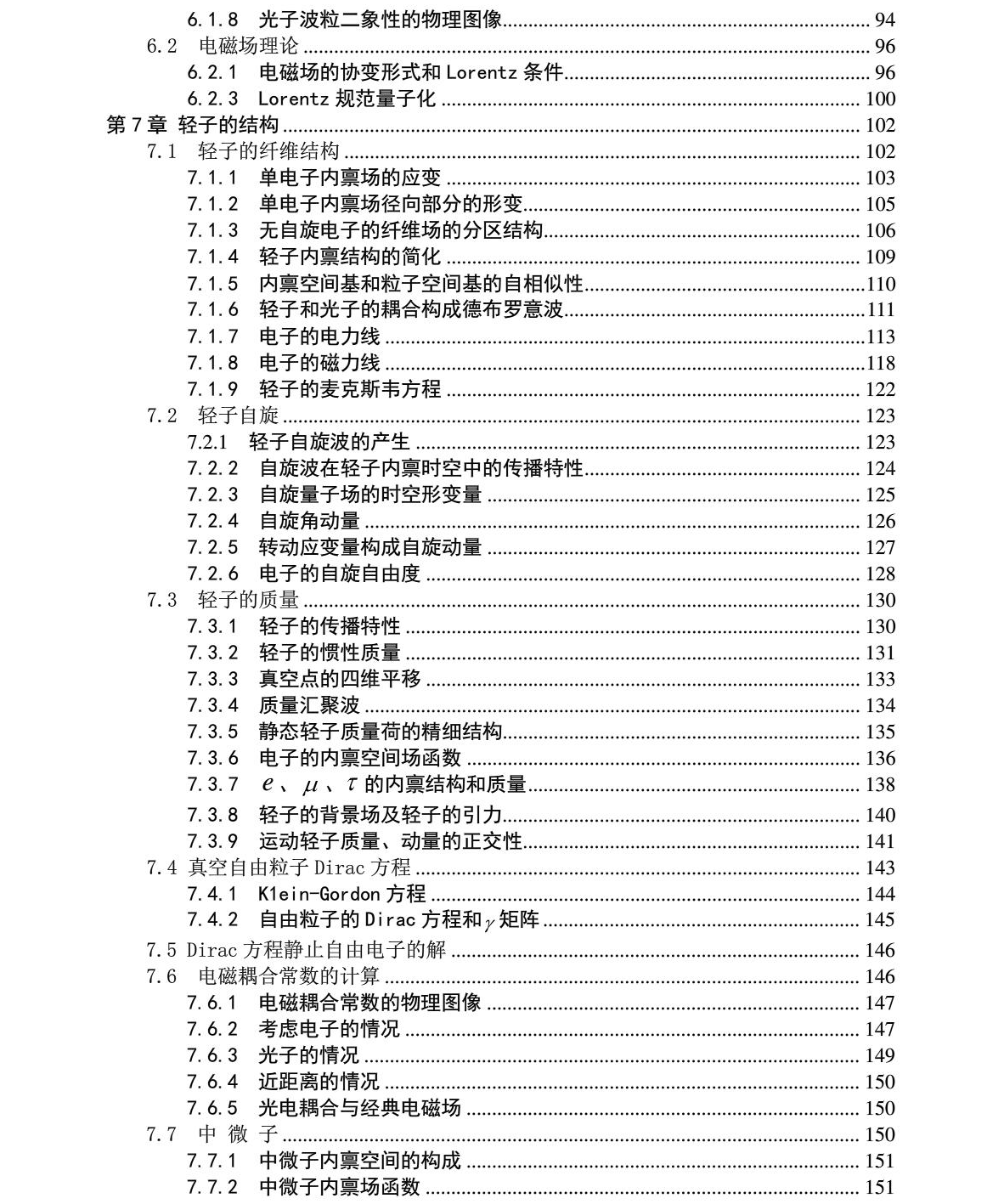 第七章 轻子的图像....................................................................... 167 7.1 轻子的纤维结构................................................................... 167 7.1.1 单电子静电场的电力线.................................................................. 169 7.1.2 电子内禀空间内单根电力线ξ 1轴位移函数............................................ 173 7.1.3 电子的纤维结构................................................................... 174 7.1.4 轻子内禀结构的简化............................................................. 180 7.1.5 内禀空间基和粒子空间基的自相似性...................................................... 181 7.1.6 轻子和光子的耦合构成德布罗意波.......................................................... 182 7.1.7 电子电荷的全同性........................................................................... 184 7.1.8 光子和轻子的差异..................................................................... 185 7.2 轻子自旋................................................................................. 185 7.2.1 轻子自旋波的内禀结构....................................................................... 185 7.2.2 自旋量子场........................................................................... 187 7.2.3 自旋角动量................................................................................ 188 7.2.4 电子的自旋自由度....................................................................... 190 7.2.5 磁场的纤维特性和自旋磁矩............................................................. 193 7.2.6 轻子的麦克斯韦方程...................................................................... 196 7.3 轻子质量的图像......................................................................... 198 7.3.1 轻子的传播特性........................................................................... 198 7.3.2 轻子的惯性质量....................................................................... 199 7.3.3 球面质量波............................................................................... 201 7.3.4 真空点的三维球对称移动产生质量.......................................................... 203 7.3.5 静态轻子和光子的耦合构成自由轻子波函数.......................................... 204 7.3.6 Schrödinger 场的量子化................................................................... 205 7.3.7 静态轻子的质量荷...................................................................... 209 7.3.8 环形质量波模型描述........................................................................ 210 7.3.9 e 、μ 、τ 的内禀结构和质量关系........................................................211 7.3.10 轻子的内禀时空........................................................................ 213 7.3.11 轻子的背景场及轻子的引力................................................................... 214 7.3.12 运动轻子质量、动量的正交性................................................................ 215 7.4 电磁耦合常数的计算.......................................................................218 7.4.1 考虑电子的情况............................................................................... 219 7.4.2 光子的情况........................................................................... 220 7.4.2 近距离的情况........................................................................ 221 7.4.4 光电耦合与经典电磁场....................................................................... 222 7.5 中 微 子.................................................................................. 222 7.5.1 中微子内禀空间的构成.................................................................. 222 7.5.2 中微子内禀场函数................................................................... 223 7.5.3 自旋量子波角量.................................................................. 225 7.5.4 中微子的静质量.......................................................................... 226 7.5.5 半向空间的概念...................................................................... 227 7.5.6 费米子场的半向空间效应.................................................................... 228 7.5.7 中微子的狄拉克方程.................................................................... 229 7.5.8 轻子的点模型构成量子力学..................................................................... 231
