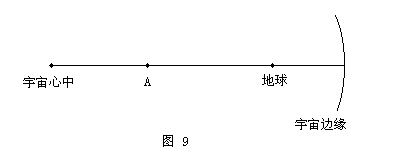 (一)没有蓝移天体的原因 如果地球靠近宇宙的边缘(图9),那么位于A 点的天体所发出的光,对于 地球上的观测者来说,斥力蓝移将大于速度红移。于是,我们将在一定空间范 围里观测到许多蓝移天体。 由于我们的周围都是红移,所以银河系位于宇宙的核心区域。