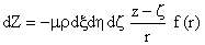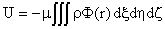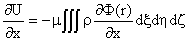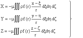 | 整个物体的引力沿各坐标轴的分量用这些式子的三重积分来表示,积分须遍及全数各正六面体: | |||||