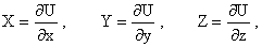 | 对点m的坐标x,y,z偏导数就等于力的分量。事实上,把U对x的微分: | |||||
