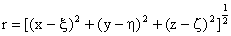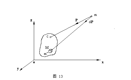| 如果我们设想这物体全部质量集中于重心C (ξ,η,ζ)(图13),那么当这个点(重心)对所给质点m依同一规律吸引时,它的引力就恰好是(m=1) | |||||