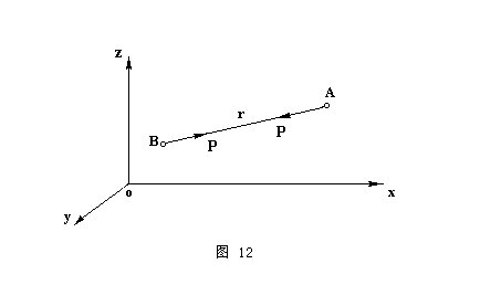 | §1. 引力论普遍公式 设有两个质点A 和B (图12),沿连线方向有力相互作用,力与质量成正比,与距离的某一函数f(r) 成正比。如果把这两个质点叫作m和m′,相互作用力叫做P,那么这个力的表达式就是 | |||||