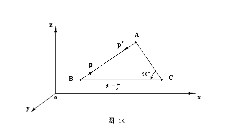 | (因为我们取m=1 )。把这个式子分别乘以力与各坐标轴夹角的余弦,就得出这个力沿各坐标轴方向的分量。把吸引点的各坐标分别减去被吸引点的各个对应坐标,再把所得的差除以两点之间的距离,我们就得到各夹角的余弦。所以,如果由点A(x ,y ,z) 吸引(图14),则cos(P,x)是正的,并且从直角三角形ABC 有 | |||||